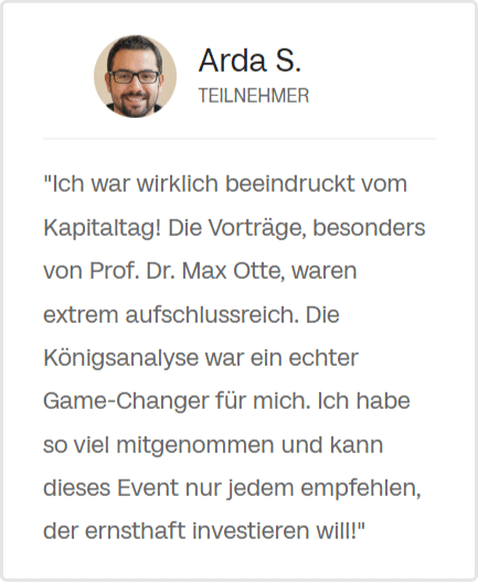 "Ich war wirklich beeindruckt vom Kapitaltag! Die Vorträge, besonders von Prof. Dr. Max Otte, waren extrem aufschlussreich. Die Königsanalyse war ein echter Game-Changer für mich. Ich habe so viel mitgenommen und kann dieses Event nur jedem empfehlen, der ernsthaft investieren will!"