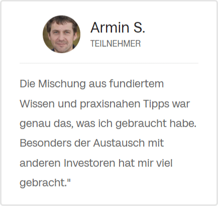 Die Mischung aus fundiertem Wissen und praxisnahen Tipps war genau das, was ich gebraucht habe. Besonders der Austausch mit anderen Investoren hat mir viel gebracht."