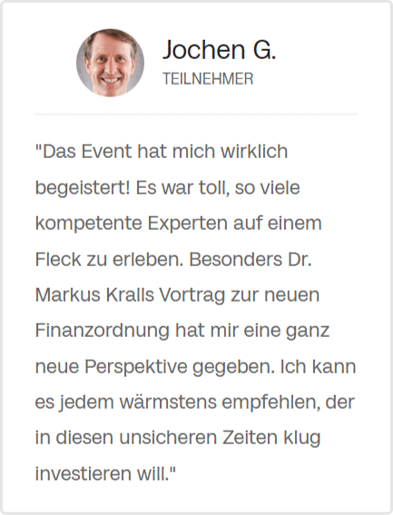 "Das Event hat mich wirklich begeistert! Es war toll, so viele kompetente Experten auf einem Fleck zu erleben. Besonders Dr. Markus Kralls Vortrag zur neuen Finanzordnung hat mir eine ganz neue Perspektive gegeben. Ich kann es jedem wärmstens empfehlen, der in diesen unsicheren Zeiten klug investieren will."