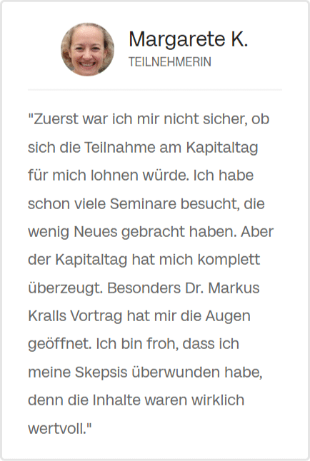 "Zuerst war ich mir nicht sicher, ob sich die Teilnahme am Kapitaltag für mich lohnen würde. Ich habe schon viele Seminare besucht, die wenig Neues gebracht haben. Aber der Kapitaltag hat mich komplett überzeugt. Besonders Dr. Markus Kralls Vortrag hat mir die Augen geöffnet. Ich bin froh, dass ich meine Skepsis überwunden habe, denn die Inhalte waren wirklich wertvoll."