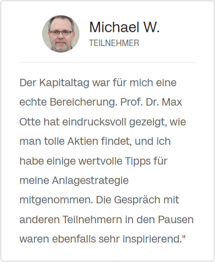 Der Kapitaltag war für mich eine echte Bereicherung. Prof. Dr. Max Otte hat eindrucksvoll gezeigt, wie man tolle Aktien findet, und ich habe einige wertvolle Tipps für meine Anlagestrategie mitgenommen. Die Gespräch mit anderen Teilnehmern in den Pausen waren ebenfalls sehr inspirierend."